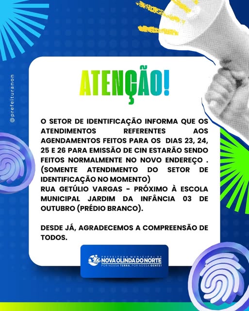 O Setor de Identificação informa que os atendimentos referentes aos agendamentos realizados para os dias 23, 24, 25 e 26, para emissão de CIN, acontecerão normalmente, porém em novo endereço.