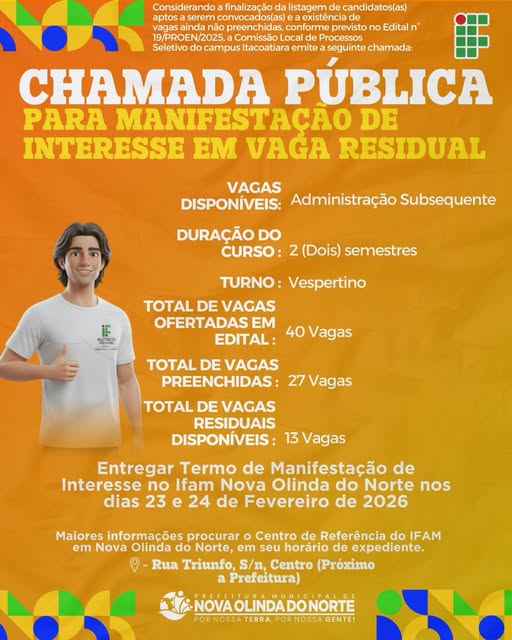 A Comissão Local de Processos Seletivos do campus Itacoatiara informa a abertura de Chamada Pública para Manifestação de Interesse em Vaga Residual do curso de Administração Subsequente, turno vespertino, com duração de 2 (dois) semestres. Conforme o Edital nº 19/PROEN/2025, foram ofertadas 40 vagas, das quais 27 já foram preenchidas, restando 13 vagas residuais disponíveis. Os interessados deverão entregar o Termo de Manifestação de Interesse no IFAM Nova Olinda do Norte, nos dias 23 e 24 de fevereiro de 2026. Para mais informações, os candidatos podem procurar o Centro de Referência do IFAM em Nova Olinda do Norte, em horário…